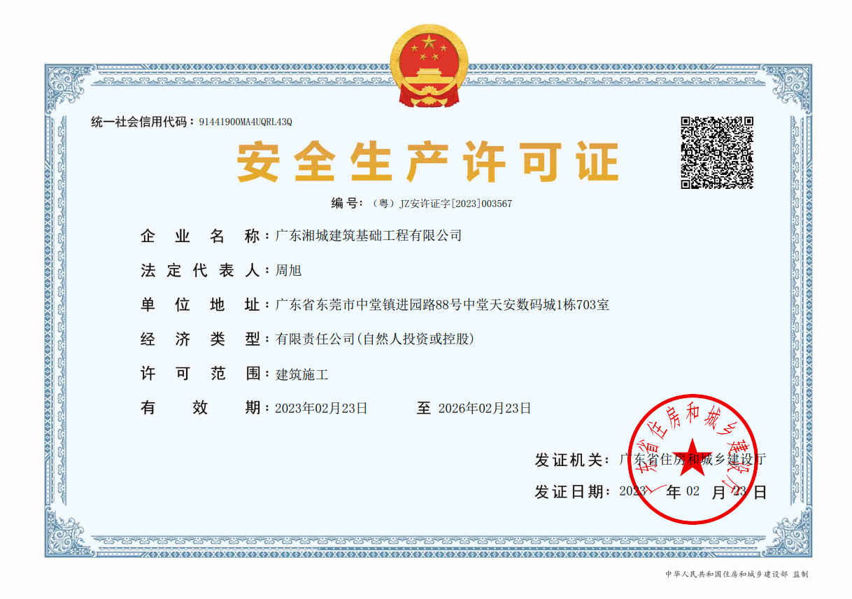 廣東湘城建筑基礎(chǔ)工程有限公司,成立于2016年,注冊資金4888萬元,持有地基基礎(chǔ)工程專業(yè)承包壹級資質(zhì),具有安全生產(chǎn)許可證。可承接各種基礎(chǔ)類施工,包括各類樁基礎(chǔ)、基坑支護、邊坡支護、地基強夯處理等施工業(yè)務(wù)。公司為地基與基礎(chǔ)工程專業(yè)承包、工程施工、技術(shù)咨詢、技術(shù)開發(fā)、技術(shù)服務(wù)、信息咨詢實體型企業(yè)。